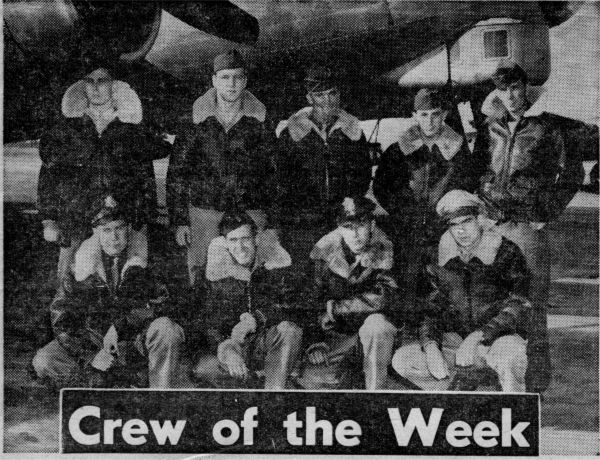 The Chilton crew (team 10-7) at Drew Air Field, November, 1944. Front (L to R): LT Robert G. Chilton (P), LT William T. Mayfield (CP), LT John J. Stanilonis (B), LT Gerald Fitzgerald (N). Standing (L to R): S/SGT Malcolm Falterman (FE/Top), CPL Thomas J. Schuster (RO/G), CPL Harold K. Hawkins (ARO/G), CPL Bert M. Clinkston (A/G), CPL Kenneth R. Dockery (AA/G). |