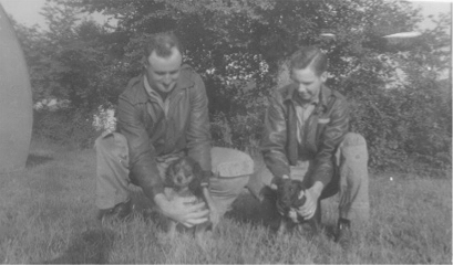 Kneeling (L to R): Henry Baxter (BG), Rex M. Wilde (CP). Standing: Clyde Watkins (ROG), Travis Wright (G), Carl Kloos (AEG), and William G. Simpson (P), in England, Nov 10, 1944. (photos submitted by John and Paul Wilde). |
