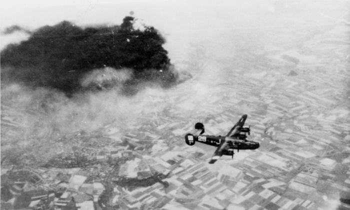 SCORPIO (#752:2S:J) headed to the rally point after the raid on Lutzkendorf. (486th collection, 8th AF Museum, Barksdale, LA via David Brown)