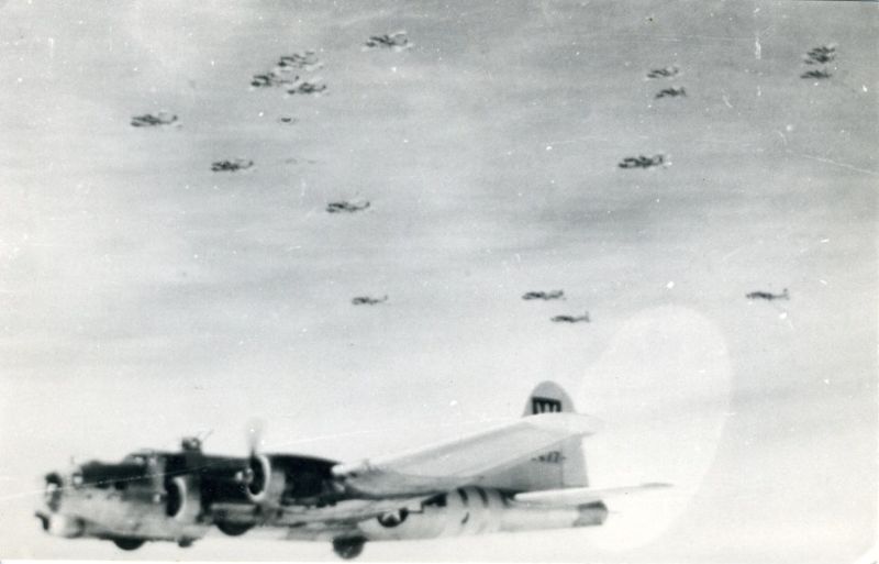 486th Heavies on their way to the target. The aircraft in the foreground may be "Blue Grass Girl II", 3R:477:V. The yellow nose band indicates it is an 832nd ship. (courtesy of Roland Andrews)