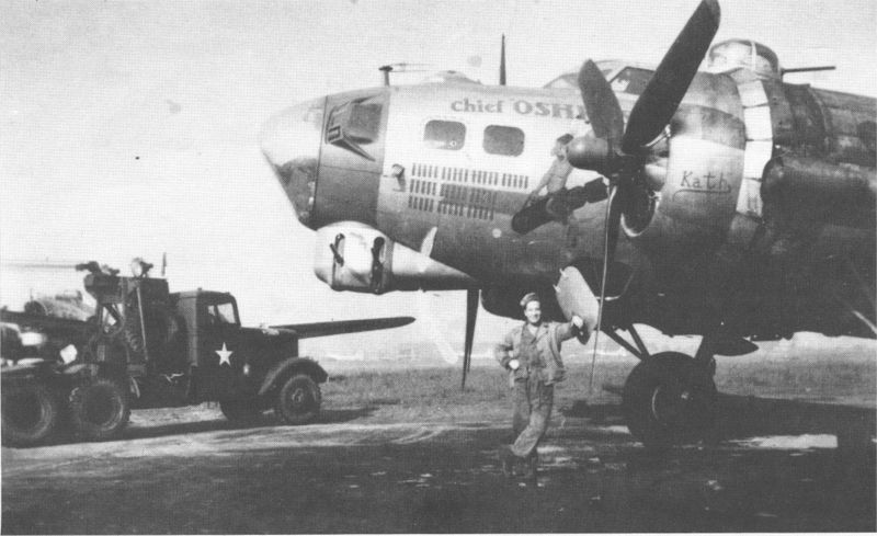 Russel B. Long, Cross crew, poses with Chief OSHKOSH. The Chief was named by the pilot, Wilbur Genz, who hailed from Oshkosh, WI.
