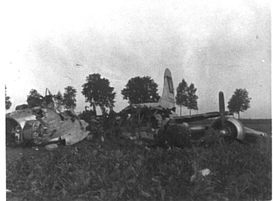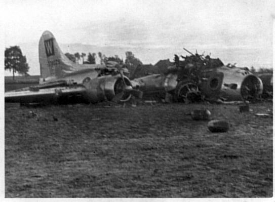During a strike of Germany industry at Köln (Cologne), Honeychile suffered engine problems. These failures forced LT Olson (Pilot) to leave formation and make for England. The crew had to eventually bail out, and the autopilot landed the aircraft near Liege, Belgium. The bombs exploded during the landing. Unexploded ordinance is visible in the photo below. (submitted by David Brown, son of Warren Brown)