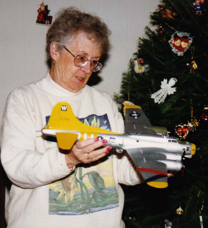 A 1:48 scale B17G depicting "Old Man's Folly," flown by the J. Miller crew, is presented to Mrs Ed Murphy. The model was built by Robert N. Abbott, Jr. Next