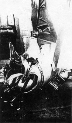 #945 ran into #891, "Old Man's Folly," at her hardstand. At right, a close up of the damage done to the tail of #891. (Merle Noyes)