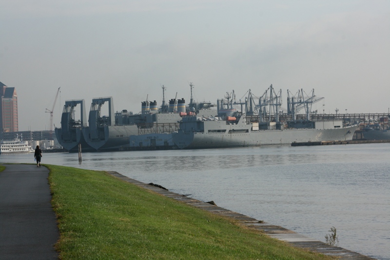 Naval support ships operated by the Military Sealift Command, and manned by merchant marines. The ship's stern at far right is the former WWII Liberty Ship (aka "Kaiser's Coffin"), SS JOHN W. BROWN. |