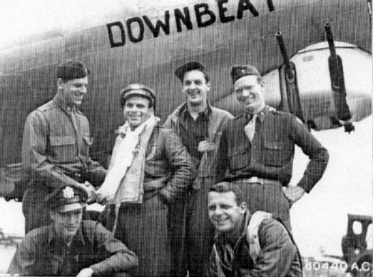 Standing (L to R): Jim Stewart (FE), Connie Tarinteno (CP), L. H. Burkhardt (P), Jerry Stack (BG). Front (L to R): A. "Mert" Minier (N), I. P. Jones (B). (National Archives)