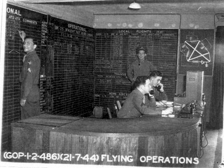 Interior of the Sudbury control tower. SGT Sidney Goodman (left) at Mission Log and CAPT John Rumisek in back; Seated (L to R): CPL John Murphy and SGT James Fuller. (John Rumisek) Aircraft | Crews | Letters | Places | Strike | Prev Copyright © 1998-2026, 486th Bomb Group Association. |