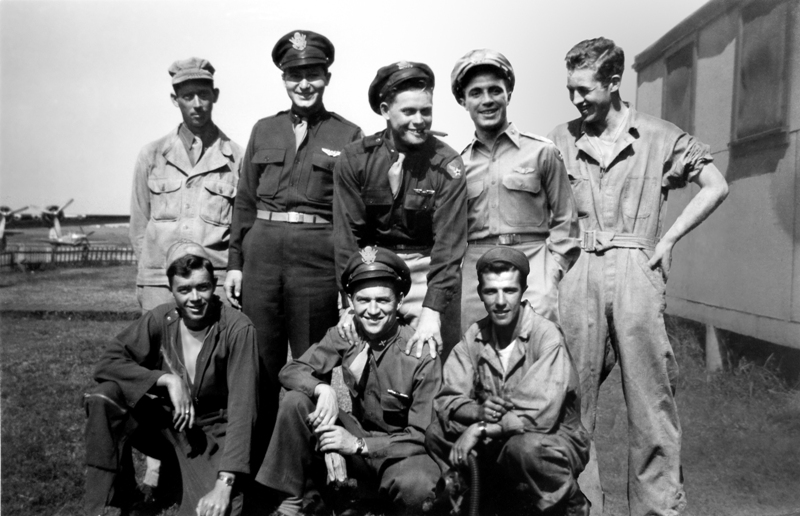 The crew photo above is modified to include two missing airmen. Back row (L to R): George Davison, (RO/G), Bertram Huberman, (N), Richard Hinze, (P), Ray Firmani, (CP), William Nelson, (WG), Bottom Row, Clarence Baugh, (TG), Darrell Dye, (B), George Pascarzi (G), John Gaba, (FE/Top, not in photo). Photo courtesy of Mitch Topal. Copyright © 1998-2026, 486th Bomb Group Association. |