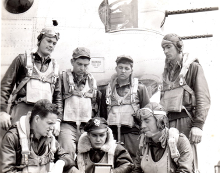Pearson's crew after the crash landing. LT Frank Prete is front, center, and Bob McCadden is front, left.