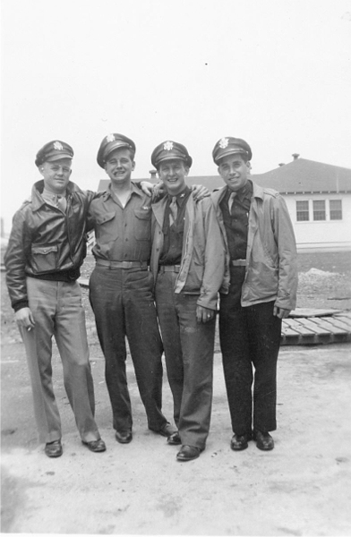 Officers in the Warmack crew in Rapid City, SD just before they flew to England. Left to right is James Warmack, pilot, Paul New, co-pilot, Ray Cowperthwaite, bombardier, Samuel R. Demidio, Navigator. (courtesy of Barry New, Paul's son) Aircraft | Crews | Letters | Places | Strike Copyright © 1998-2026, 486th Bomb Group Association. |