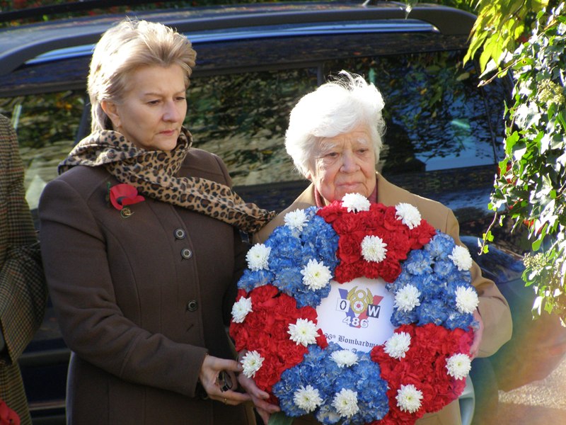 Today in the village of Little Waldingfield, for the first time, villagers laid a wreath to the 486th Bombardment Group. The wreath was laid by Mrs Coodie Sparkes a lady of 93, who in 1944/45 with her husband, ran the White Horse Public House at the same time as young American servicemen from the airfield would visit for their pint of 'warm beer'. Coodie remembers the airmen fondly, especially George Sherlock, Frank Tysl and M L Kirkpatrick (P-40) who remained friends well after the war had ended. Above, Jill Duffy, wife of Dennis Duffy, and Coodie Sparkes take the wreath to the War Memorial at St Lawrence Church. (Photos courtesy of Dennis Duffy). |