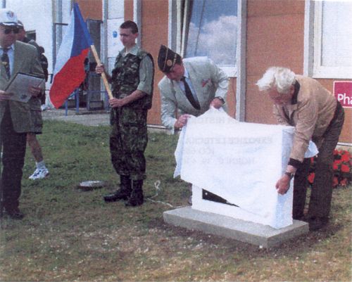 A member of the V. Vadlejch, Sr. (left), and Jan Hladky, a member of the Czech Free Army of the Royal Air Force, unveil the monument.