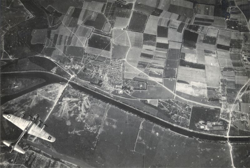 Aerial view of the top of #43-37996 (2S:A), "Hock Shop", flown by LT Unger, flying to the northeast of Caen after bombing a tactical target near St. Sylvain, France. The direction of view is west-northwest, and the aircraft's heading is northwest. This #996 was moments away from flying over the French village of Blainville-sur-Orne at left center. The prominent waterway is the Caen Canal, a ship canal between Caen and Ouistreham. The Orne River is visible at bottom left, below the aircraft's starboard wing. There are about 30 aircraft on the ground in the farm fields at upper right. These appear to be assault gliders. There also appear to be at least two assault gliders on the ground near the bridge at bottom right. This is the Caen Canal bridge at Benouville. British glider- The photo was shot from #44-6311, "Coaltown Express", flown by LT Hilfinger. Copyright © 1998-2026, Paul Webber, Hank Schurwan and the 486th Bomb Group Association. |