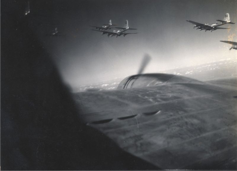 The Fort in the upper right is 44-6314:2S:D, "Ruthie Bee". This formation of 486th Fortresses is on a mission to Giebelstadt, Germany on September 10, 1944.