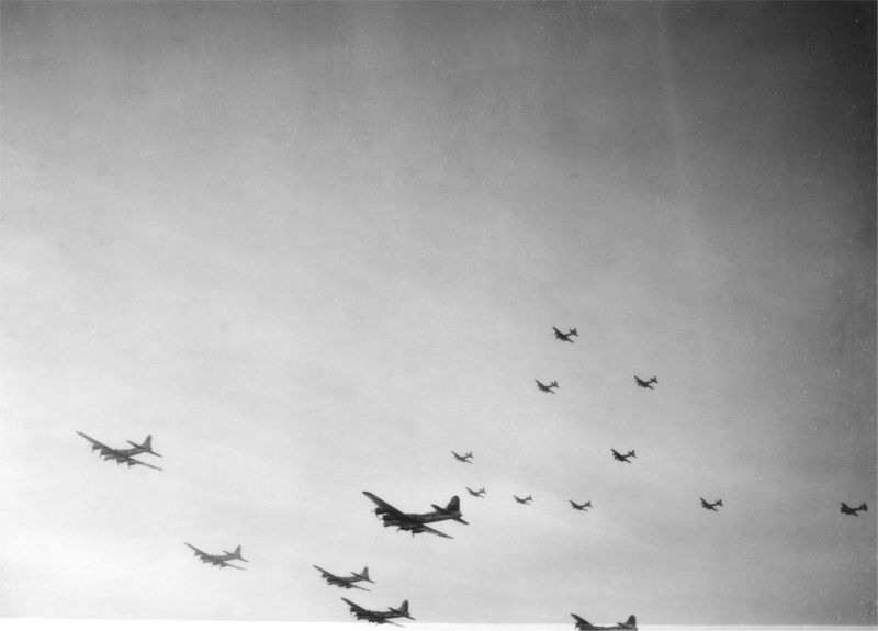 This photo was taken by 44-8025, which served as the weather ship on the November 5th mission to Kaiser Lautern. The ship at the bottom edge appears to be 908:H8:H, "Woeful Bear", flown by LT Krock. The ship nearest the camera (just left of center), is 142:H8:P, "Li'l Butch", flown by LT Bedard. Beneath it is 902:3R:A, "Mr. Completely", flown by LT McElroy. Copyright © 1998-2026, Paul Webber, Hank Schurwan and the 486th Bomb Group Association. |