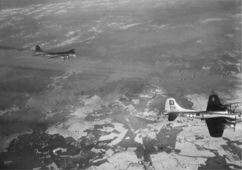 800:H8:S, flown by LT Beard, is at right. 246:H8:D, "Vermont Maid", flown by LT Buettner is at left. Both on are the December 23 mission to Hamburg. Photographed from 943:4N:G, "Fertile Turtle", flown by LT St Clair. Main Gallery Copyright © 1998-2026, Paul Webber, Hank Schurwan and the 486th Bomb Group Association. |