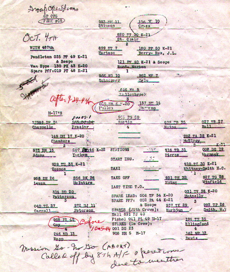 This is a copy of a flimsy sheet given to pilots before a mission. The sheet shows which aircraft is flying in which slot, and other assignments. For a larger version click on photo. (Arthur May) Aircraft | Crews | Letters | Places | Strike Copyright © 1998-2026, 486th Bomb Group Association. |
