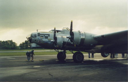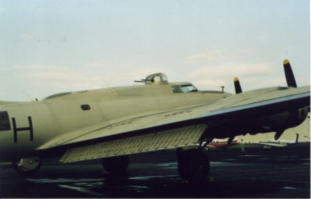 passions. For me, that "thing" was military aviation and WWII history. As a youngster I built model airplanes, and each week I could be found glued to the TV watching "12 O'clock High." I watched spell-bound as GEN Frank Savage, flying "Piccadilly Lilly," led his bomber squadron over targets in Germany; his gunners fending off vicious fighter attacks. I imagined myself a part of his crew, manning a gun or working the bombsight. My youthful naivetö allowed me to believe this to be a glorious adventure. I wanted to fly in a B17! Throughout the years my father took me to air shows and I continued to build models. When I was eighteen, I decided on a career in Naval Aviation and enlisted with the hopes of flying fighter aircraft. However, I didn't figure on being disqualified because of my severe nearsightedness. Even though I had to settle for a turbine powered destroyer, my fascination with flying continued. I found modern jets to be as equally captivating as their WWII ancestors. The B17 still loomed large in my mind. I would attend air shows that had B17s on static display, but none were flying, much less offering rides. The chances of fulfilling my dream seemed to dwindle with each passing year. In 1998 I was at the EAA fly-in at Oshkosh, WI., and saw the "Aluminum Overcast" in flight. It was a thrilling sight, but I thought it was just part of the demonstrations taking place that day. A few months later I learned that the EAA took the Aluminum Overcast around the US giving tours. The chance to fulfill my dream was at hand, but the cost was a bit steep. When I told my wife of this opportunity she insisted I go, and offered to pay the bill. I protested, but she convinced me we could do this, and insisted I go fly. I made my arrangements and on May 23, 1999 I arrived for my first B17 ride. I arrived two hours early. This gave me time to check in, get a short briefing, and then check out the plane. Few people were there and that enabled me to get up to the plane without being in anyone's way, or anyone in mine. I walked around the aircraft studying all the details. I stood in the wheel well, ran my hand along the wing and stared up into the nose cone. It was beautiful, but not as big as I envisioned. I analyzed the wings: The Clark wing has a large surface area which provides a lot of lift and has a relatively low stall speed compared to the B24. However, the long cord does increase drag, reducing the aircraft's cruise speed. Moving along the waist I noticed how it narrowed. This may prove a problem moving through the aircraft. I stand 6' 2" and suspected the ceiling height was slightly less. The horizontal stabilizer was huge. Its span was larger than the wingspan of many fighter's. The stabilizer was about chest high and I examined the controlling surfaces. During WWII the control surfaces were made of a resin impregnated fabric which reduced the weight of the aircraft. This material had a more modern origin and felt more like a drum head, and had a similar sound when I thumped it. The rudder and ailerons used the same material. |