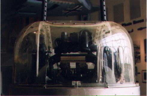 The ball turret was operated by the use of foot pedals. The gunner sat in a reclined position with his feet raised above the guns. The gunner had 360ö of motion in azimuth and 0ö to -90ö in elevation. The faceplate was unarmored plexiglas 13" in diameter. (click on picture for more photos) |