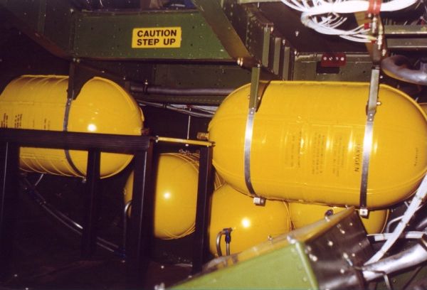 Liquid Oxygen bottles were needed to supply oxygen on high altitude missions. These were located below the flight deck.