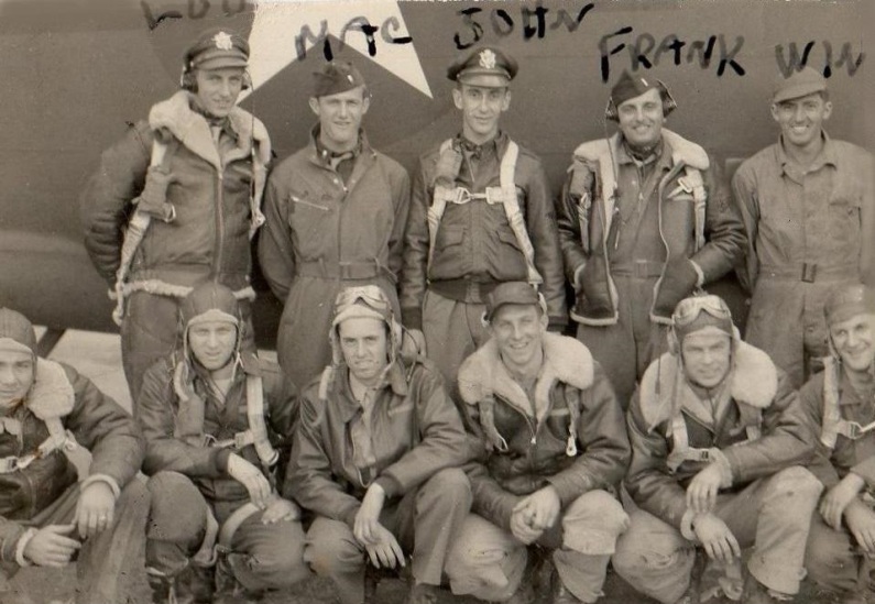The John Simmons' Crew Standing (Left to Right): LT Lowell W. "Low" Markert (DRN), LT Webster O. "Mac" McCarthy (CP), LT John S. Simmons (P), LT Frank P. "Tambie" Tamburino (B) and SGT William L. Whitney (BG). Front: SSGT Oresto J. Angelini (FE/G), SGT Henry A. Gutenstein (RO/G), SGT Morton M. Lehner (RWG); SSGT George M. Peppard (TG). |