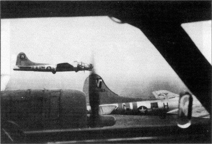 The 486th in flight. The nearest aircraft is 43-38163 (code 4N:H). The aircraft in the background has the plane code S. (James Hickey)