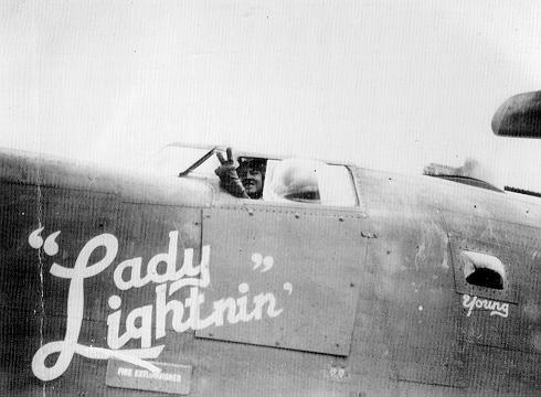 Ray Zuker (P), 832nd BS (H), flashes the victory sign from "Lady Lightning," (submitted by Ralph Young)