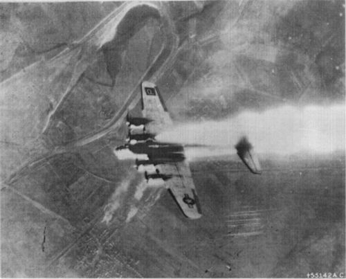 Our sister group, the 487th, loses a fort, 43-37877, on a mission to Merseburg, Germany, on 30 November, 1944. On board were Lloyd W. Kersten, 1/LT, Pilot; Henry E. Gerland, 1/LT, Copilot; James W. Hyland Jr., 1/LT, Navigator; Warren H. Ritchhart, 1/LT, Bombardier; Arnold R. Shegal, T/SGT, Engineer; John D. Eberhart, T/SGT, Radio operator; Everett S. Morrison, S/SGT, Ball gunner; Joseph M. Miller, S/SGT, Waist gunner, and Maurice J. Sullivan, S/SGT, Tail gunner. LTs Ritchart and Hyland survived and were taken POW. The others were killed. Photograph from National Archives and crew information courtesy of Paul Webber. Aircraft | Crews | Letters | Places | Strike Copyright © 1998-2026, 486th Bomb Group Association. |