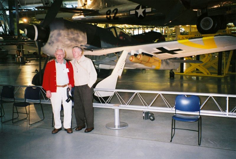 Bill Sweet and Eugene Dembowski stand before a German Fw-190F-8 at the Steven Udvar-Hazy Center.