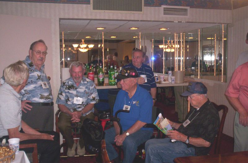 | Clint Pentz with his back to the camera listens to Bill Hare, 833rd. To Bill's left is David Burch, Randy Ormand and Gerry Lewis. John Cirelli is standing behind Randy. Gerry is David's brother-in-law, and is a Navy veteran having served on LST 818 during WWII (photo courtesy of Mary Lou (Woodard) Thomas) |