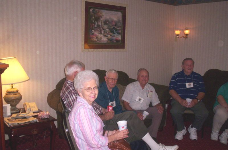 Fern Hobbs and sits in front of her husband, Neual, 832nd. Seated are Herb Basener, 835th, Harry Theobold, 835th, and John Cirelli (left to right). (photo courtesy of Mary Lou (Woodard) Thomas)