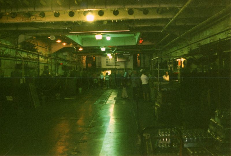 The cargo bay facing aft. the "green" area in the overhead is one of the hatches through which cargo may be passed between the bay and topside areas. Machinery areas, and berthing spaces are located off the bay on either side. |