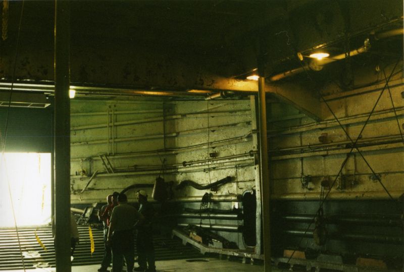 Cargo can be transported ashore through the door at left. The LST's are flat bottom boats that can be beached. A ramp is lowered through this door.