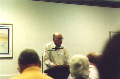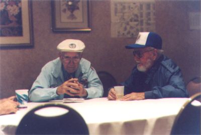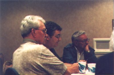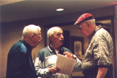 | Top left: From (L to R) John Bacon, Bill Steward and Bob Moore, all 834th. Top right: Bob Bee, 832nd, (left) talks with Rowland "Else" Elsenbaumer, 832nd.. Below left, Bill Nelson, 834th, (left) and Reece Jameson, 832nd, (right center) listen to Bob Crews, while Robin Smith (left center) looks through Bob's memorabilia. Below right, Burt Paquin addresses the gathered members at the general membership meeting. | |
