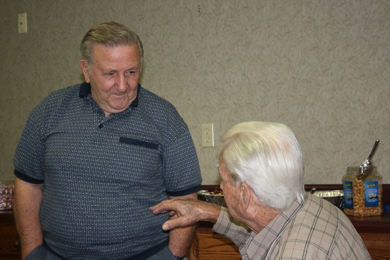 | John Cirelli, 835th, and Bob Crews, 834th share some stories. Bob and John were shot down on April 7, 1945. John was a member of LT Center's crew, and Bob was a pool gunner flying with LT Krenz's crew. Both finished the war as Prisoner's of War. |