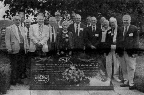 486th veterans on the 2000 UK tour pose behind the 486th Memorial in Sudbury. At front center is vice commander Kay Hutchins and commander Bob Cross. At far right is Bob Nolan. third from right is Bill Phelps. |