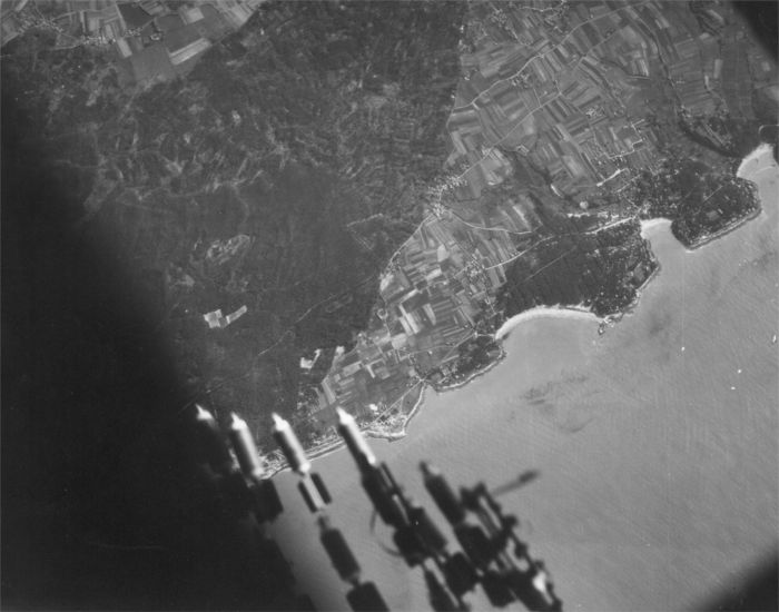 20 lb M41 framgmentation munitions seen from the Bomb Bay of a B24. The target is near Royan, France.