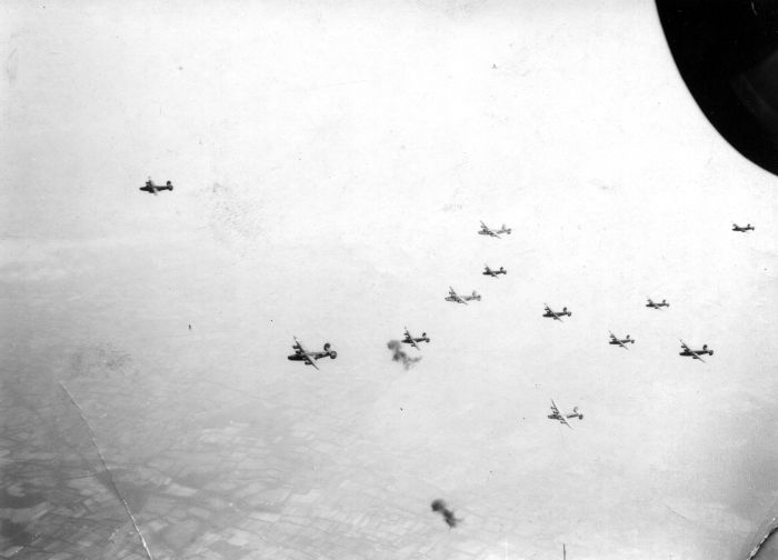 Formation of B24s encounter flak. Note, three have a natural aluminum finish, while the rest are OD/gray.