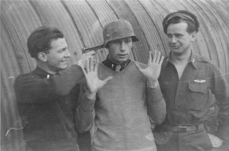 Left to right holding 45 pistol to R. Dauenhauer's head is Ray Cowperthwaite, Bombardier on James Warmack crew, Richard Dauenhauer, pilot, Paul New, co-pilot. Taken in January 1945 . Paul New said he had one mission to go. He flew his last mission in late January. (taken from his log book) (courtesy of Barry New, Paul's son) Aircraft | Crews | Letters | Places | Strike Copyright © 1998-2026, 486th Bomb Group Association. |