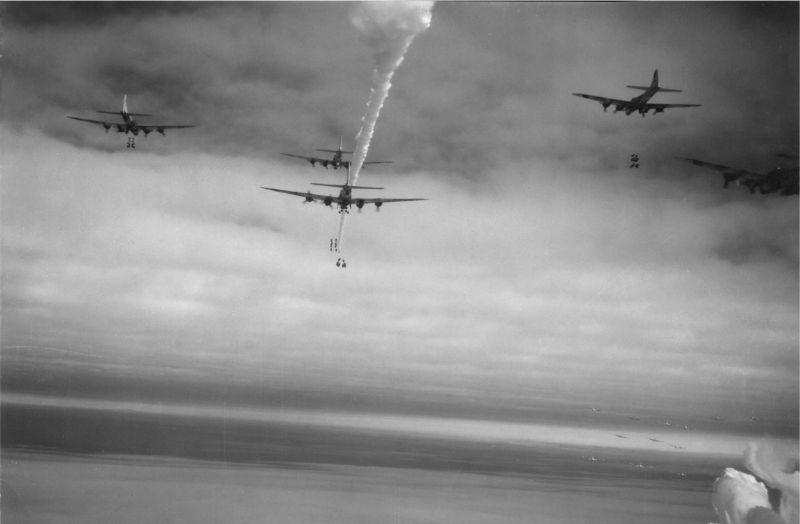 Bombs away over Neumarkt, Germany, February 23rd. The smoke was dropped by the lead aircraft, top, left of center. The flight characteristics of the marker is causing it to depart the stick of bombs it was dropped with. If you look closely, you'll note the bright dot at the bottom of the aircraft. This is the H2X dome for the radar used to bomb through overcast conditions. The operators of this equipment were called, "Mickey Operators", and their sets were called "Mickey Sets". The term "Mickey" for WWII airborne radar systems, specifically the H2X, originated from Major Fred A. Rabo of the USAAF, who renamed the MIT radar system (H2X or AN/APS-15) as "Mickey Mouse". He shortened it to "Mickey" and it became the common name for the system throughout the war. Main Gallery Copyright © 1998-2026, Paul Webber, Hank Schurwan and the 486th Bomb Group Association. |