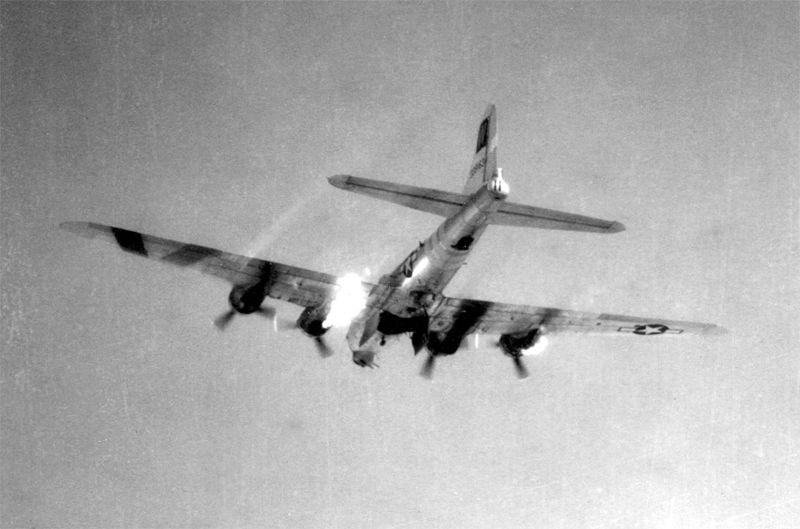 163:H8:S, flown by LT Center catches fire after being struck by incendiary bomblets, from a leading A/C. This photo was taken from 942:3R:J, "The Blue Flippy", flown by LT Dolan. Main Gallery Copyright © 1998-2026, Paul Webber, Hank Schurwan and the 486th Bomb Group Association. |